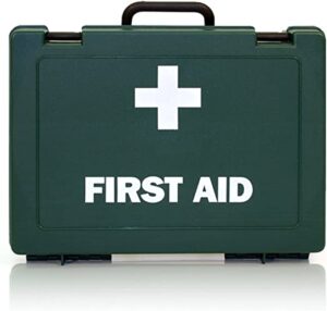 20x Assorted Washproof Plasters; 2x Sterile Eyepads with bandages; 4x Non-woven triangular bandages; 6x Safety pins; 6x Medium 12cm x 12cm sterile dressings; 2x Large 18cm x 18cm sterile dressings; 10x Alcohol-free hygienic cleansing wipes; 1x Pair of Powder-free Vinyl gloves; 1x First Aid administration guidance leaflet